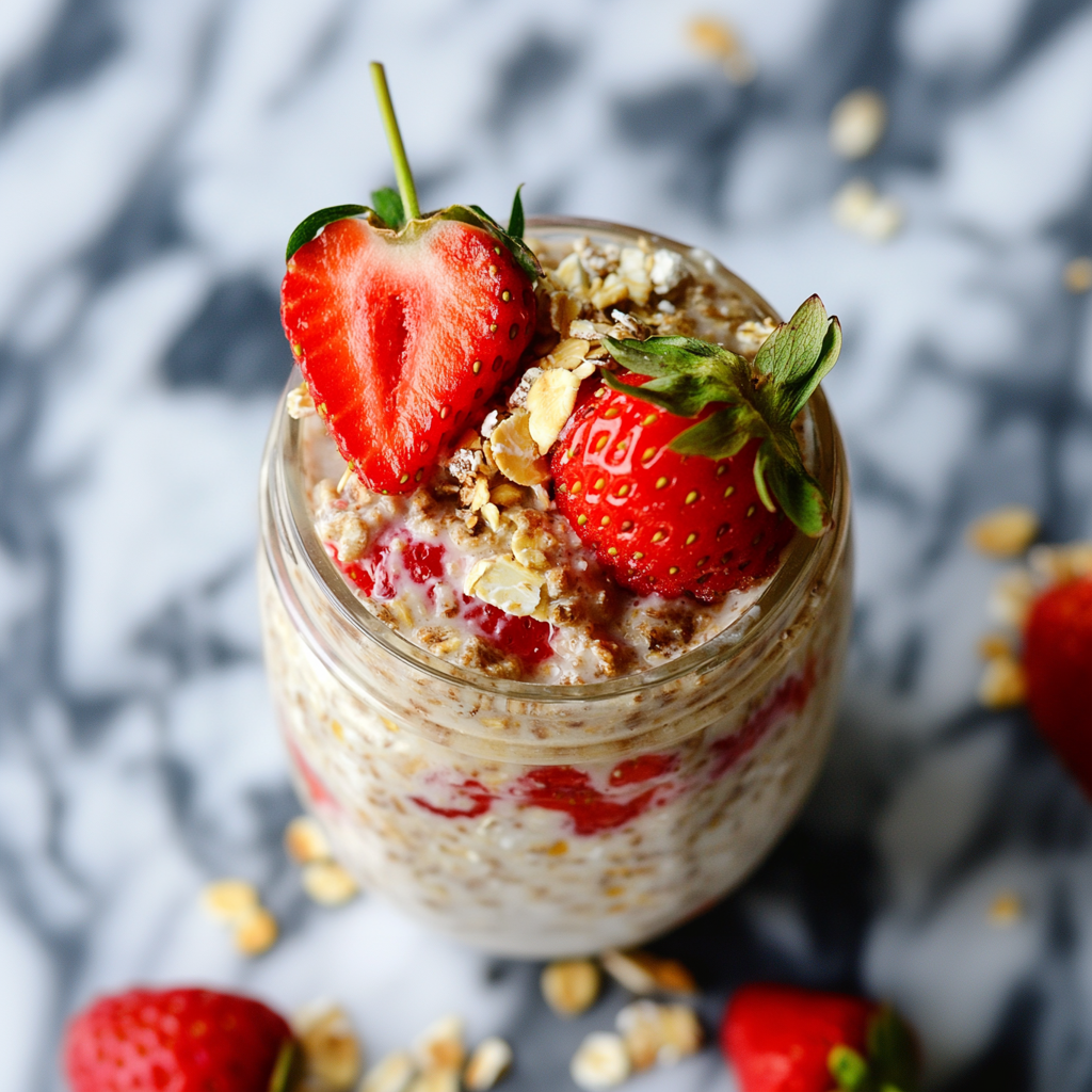 Strawberries & Cream Protein Overnight Oats Looking for a breakfast that tastes like dessert and supports your wellness goals? This high-protein, creamy, and satisfying overnight oats recipe is packed with good-for-you ingredients and takes just minutes to prep! Ingredients: Directions