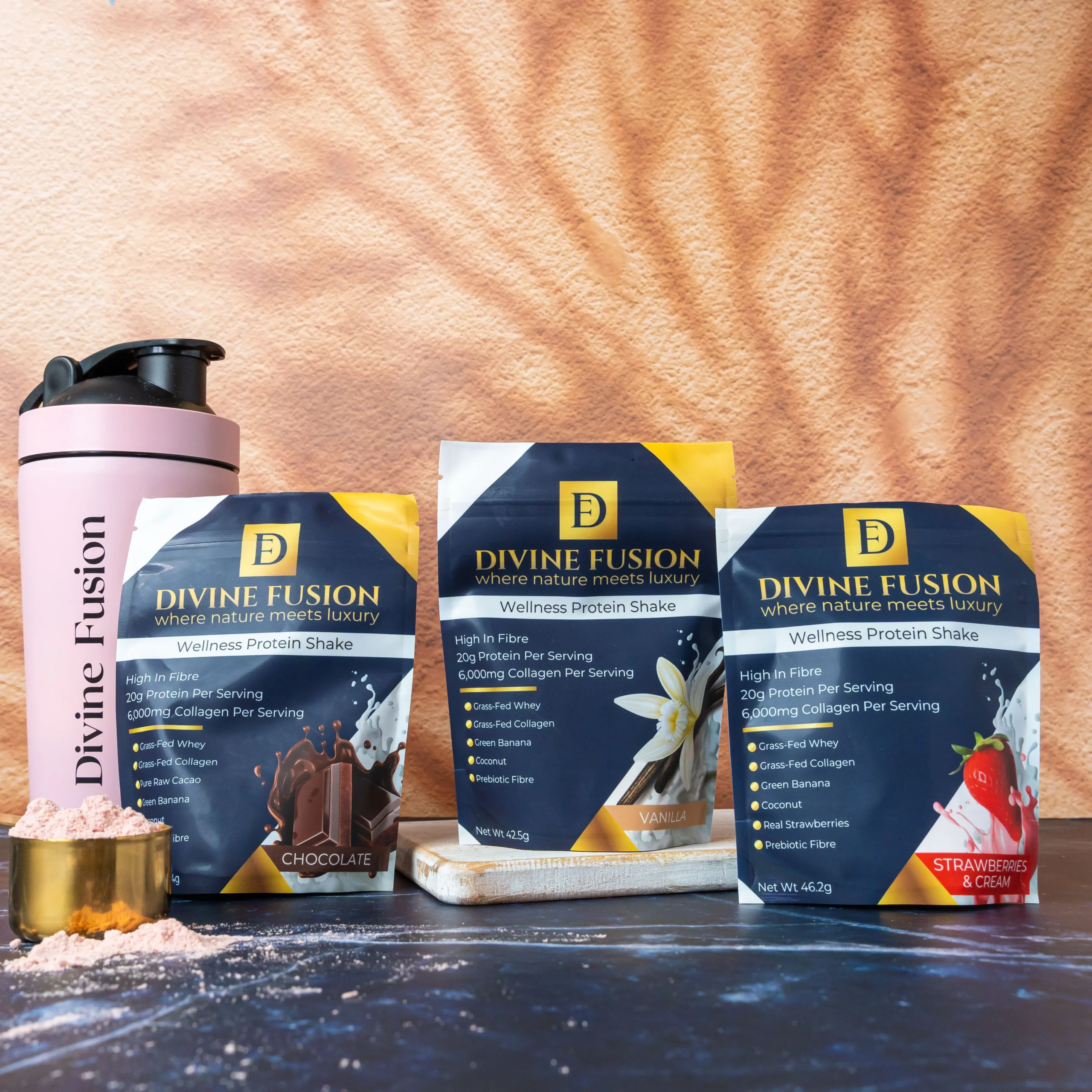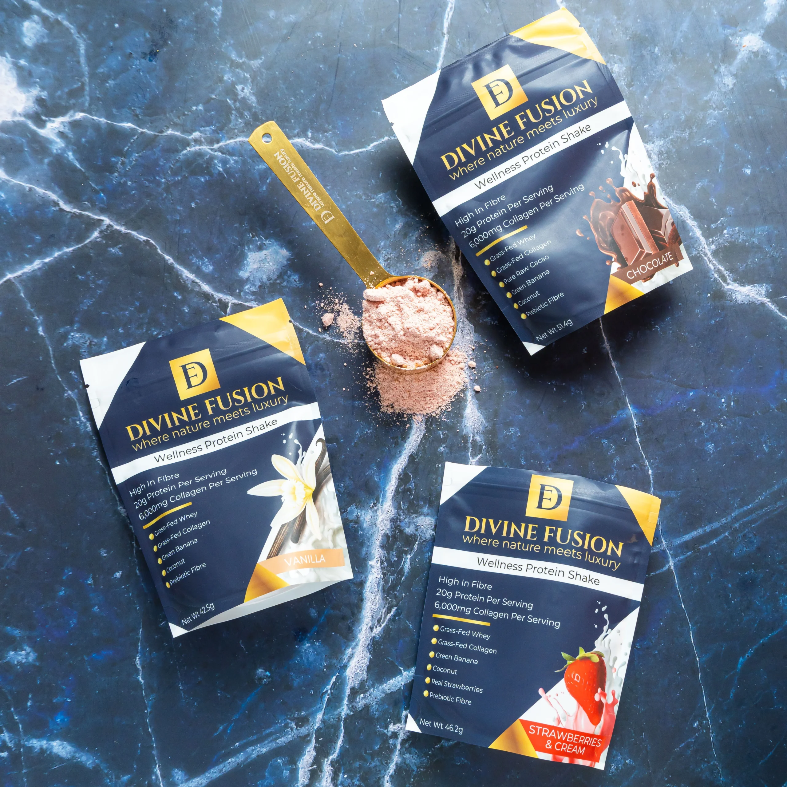 Whichever you choose, all three flavours mix effortlessly. No gritty texture. No bloating. For best results: add one scoop to a blender with your liquid, blend for about 10 seconds (in your blender or with your Divine Fusion whisk), and you’re ready to go!