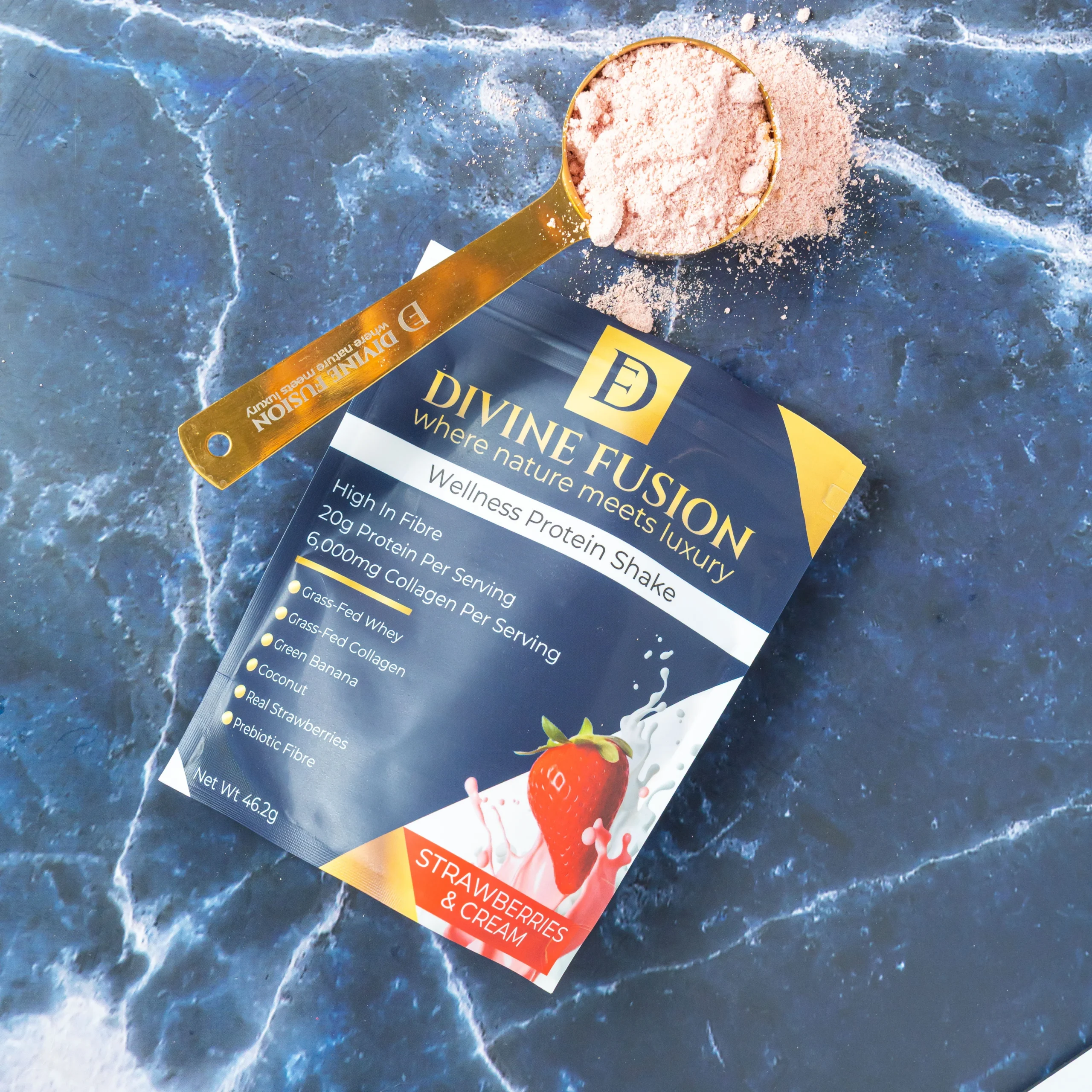 Everything you need to start: generous servings of two of our signature blends, a premium stainless steel shaker, a golden serving spoon (for that special Divine Fusion touch), a luxurious double-whisk frother, and thoughtful packaging that makes wellness feel like self-care, as it should!